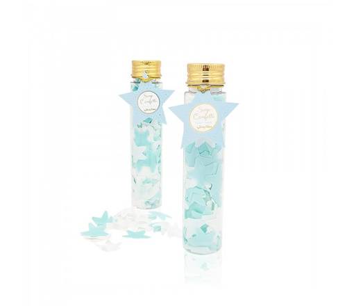 Confetti αστεράκια σαπουνάκια 10gr σε πλαστικό διάφανο δοχείο 2,8cm x13cm ύψος, μαζί με καρτάκι με χρυσοτυπία.