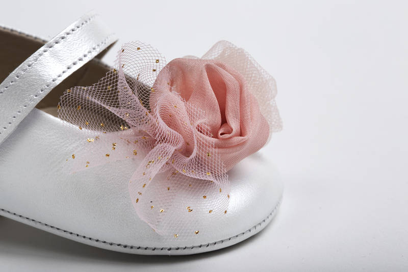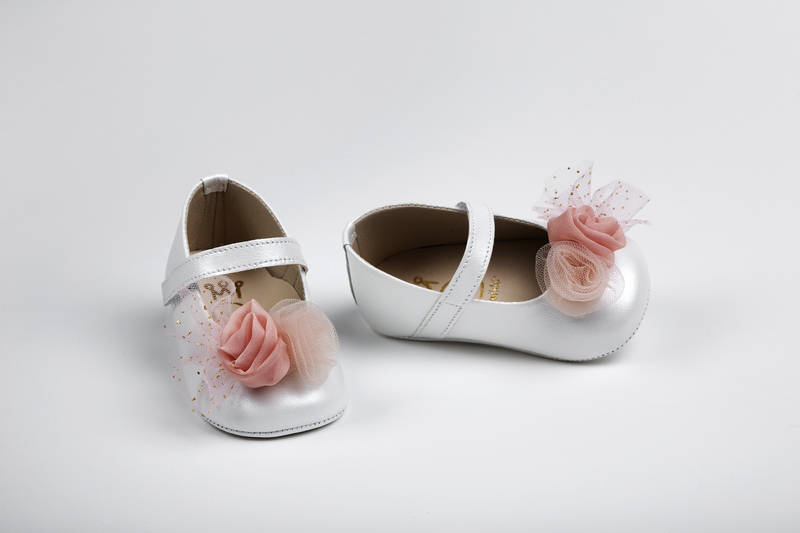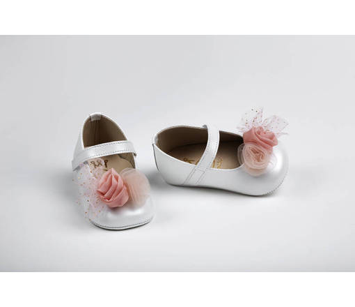 Κ2206Ε Μπαλαρίνα αγκαλιάς από εκρού δέρμα, διακοσμημένη με δύο τριαντάφυλλα από τούλι και μουσελίνα dusty pink κλείσιμο με Velcro,