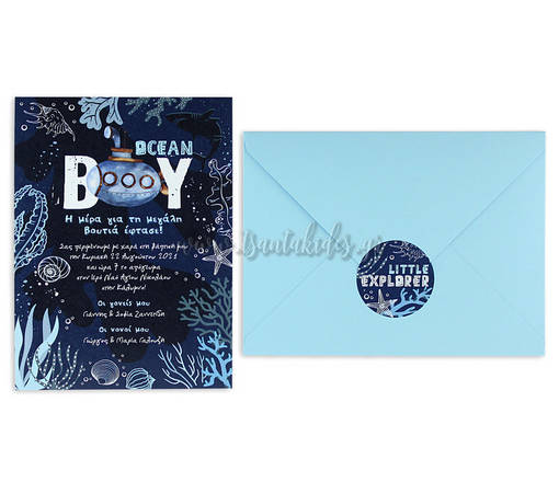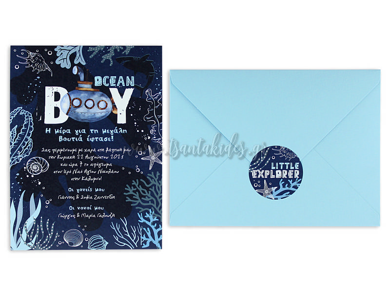 Προσκλητήριο βάπτισης για αγόρι με θέμα το υποβρύχιο και το βυθό. Το προσκλητήριο