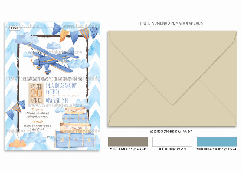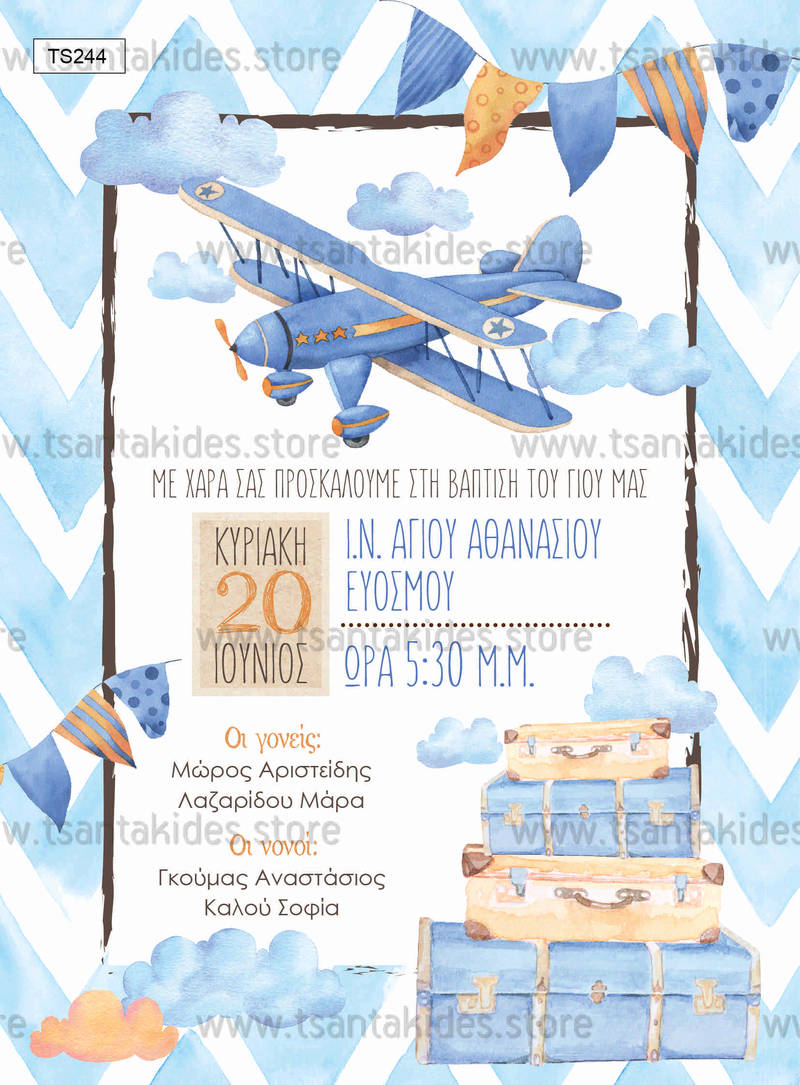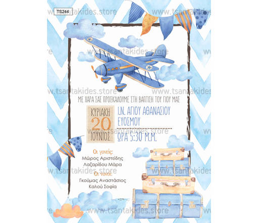 Προσκλητήριο βάπτισης για αγόρι με θέμα travel και αεροπλανάκι. Η κάρτα του