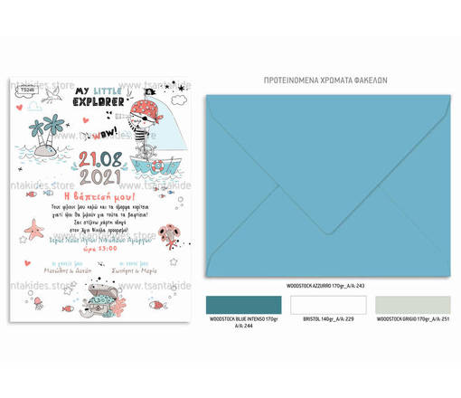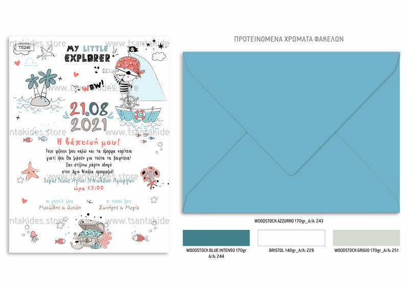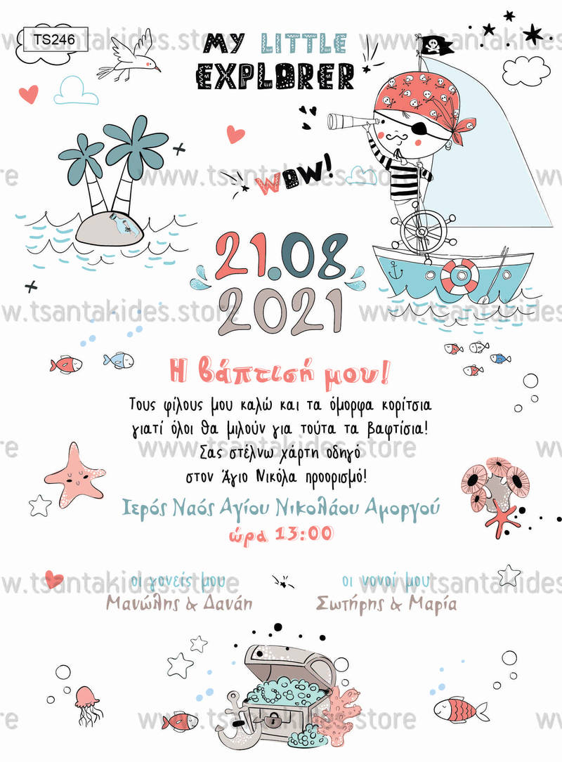 Προσκλητήριο βάπτισης για αγόρι με θέμα τον πειρατή. Η κάρτα του προσκλητηρίου είναι