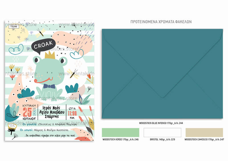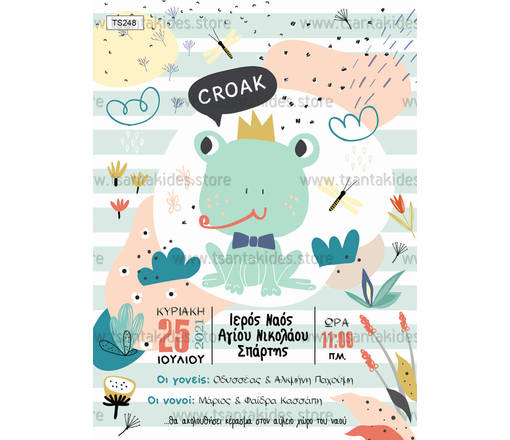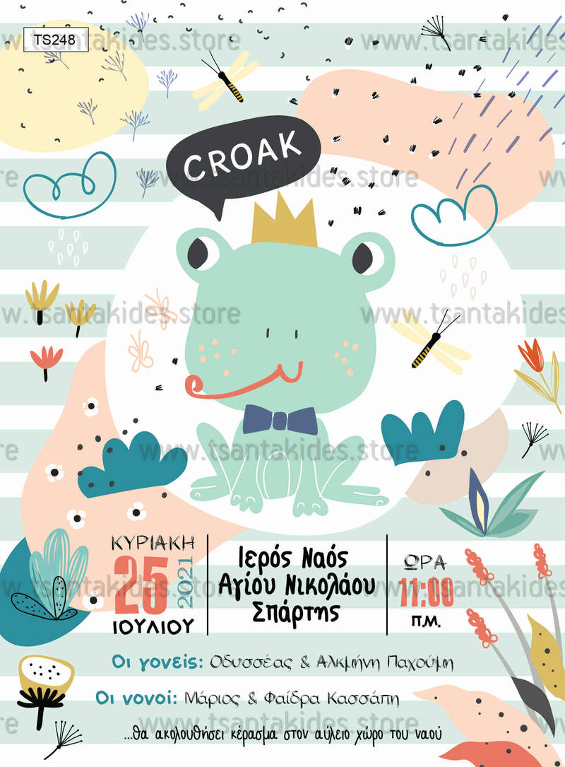 Προσκλητήριο βάπτισης για αγόρι με θέμα το βατραχάκι. Η κάρτα του προσκλητηρίου είναι
