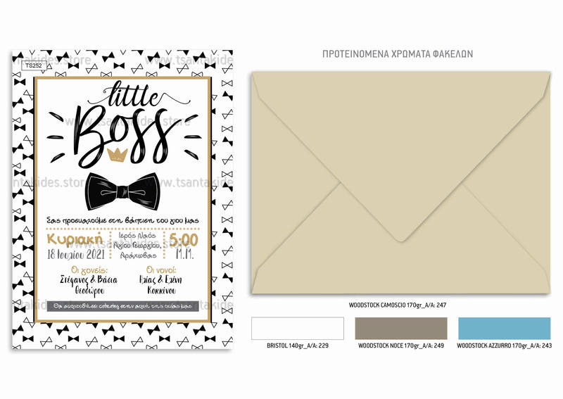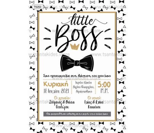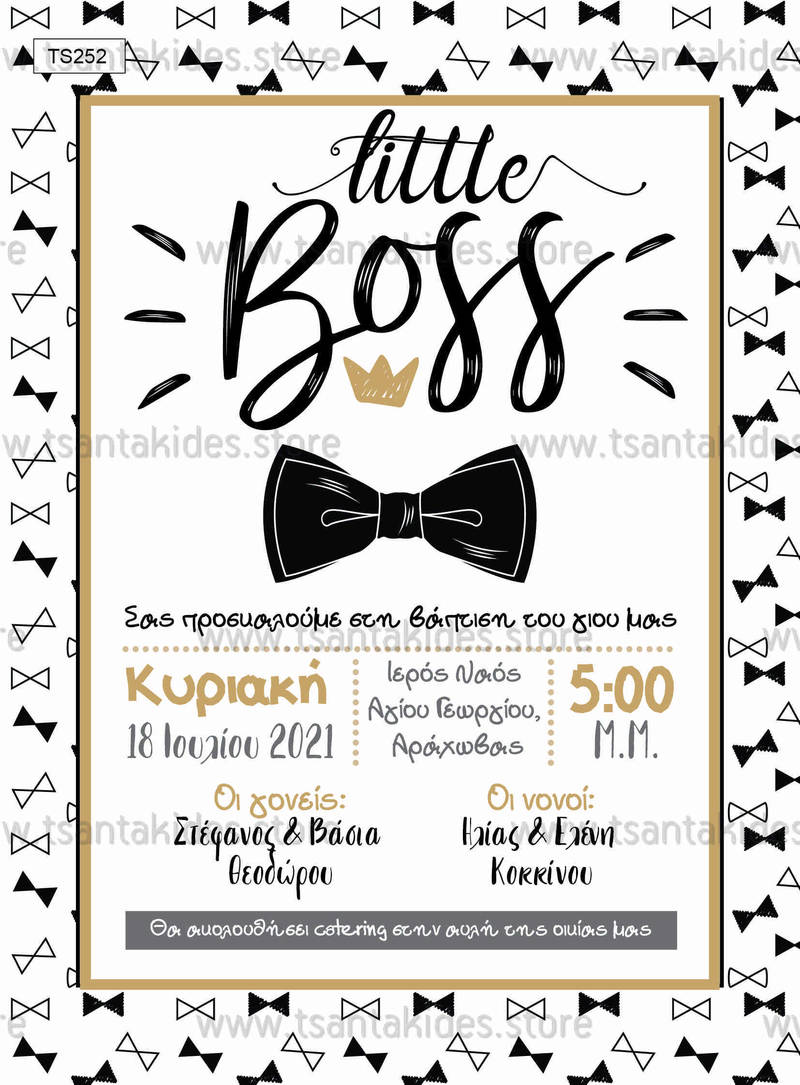 Προσκλητήριο βάπτισης για αγόρι με θέμα little boss. Η κάρτα του προσκλητηρίου είναι