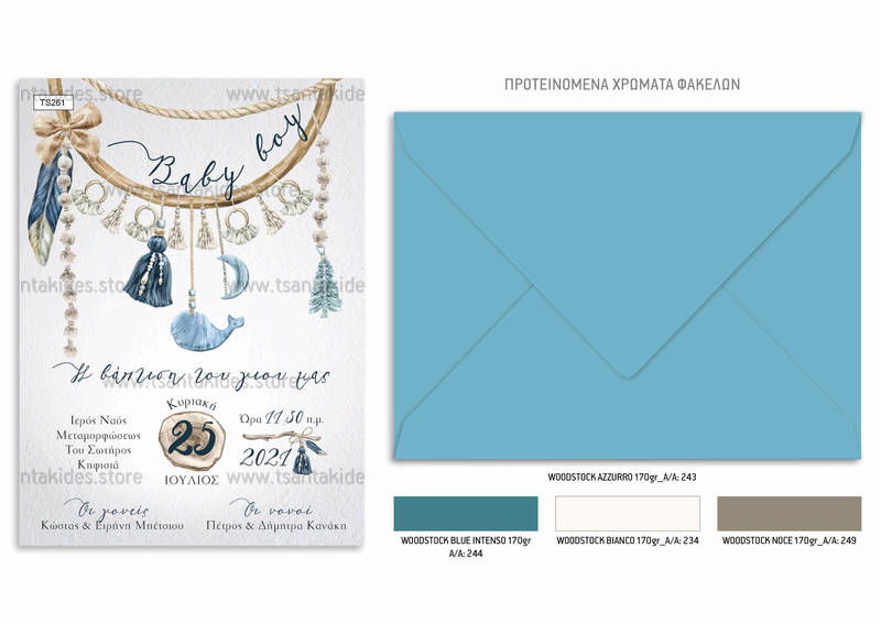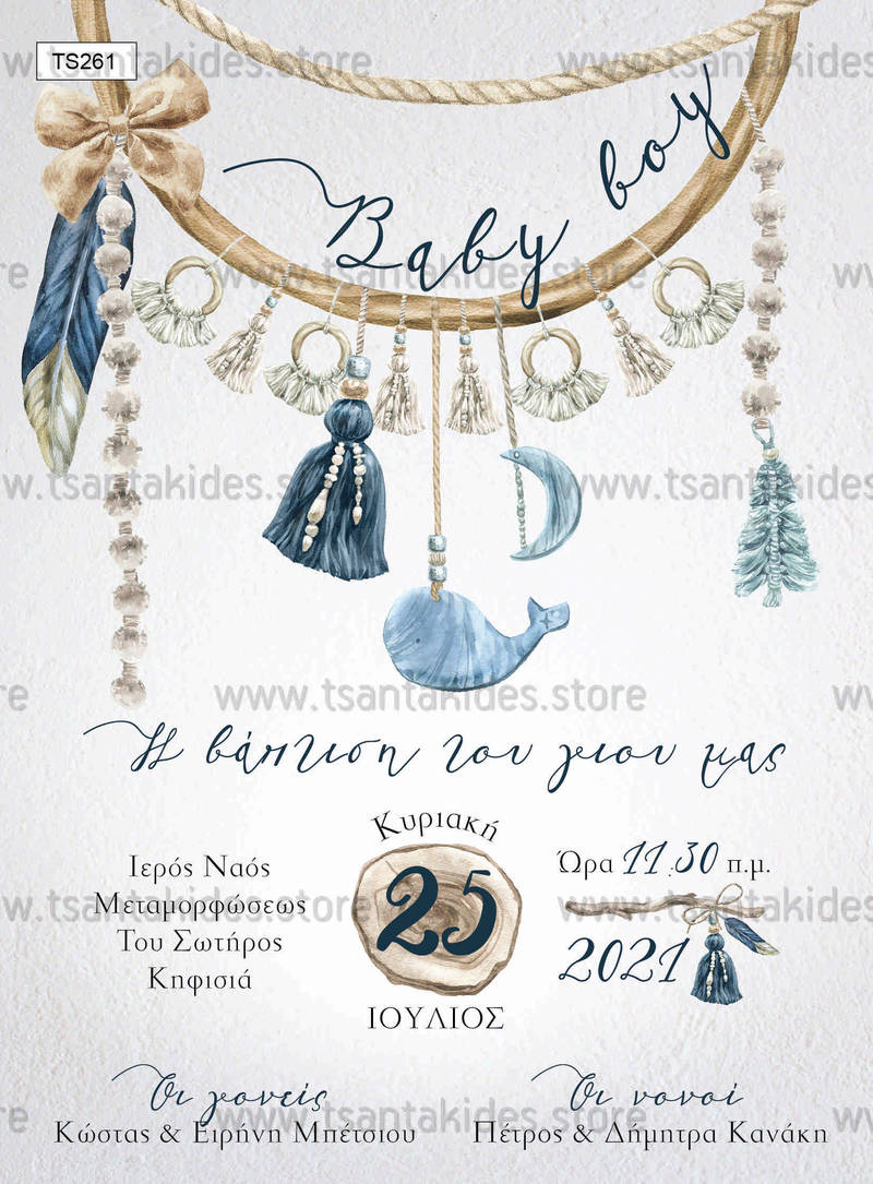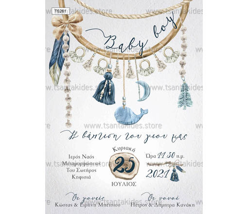 Προσκλητήριο βάπτισης για αγόρι με θέμα boho ονειροπαγίδα. Η κάρτα του προσκλητηρίου