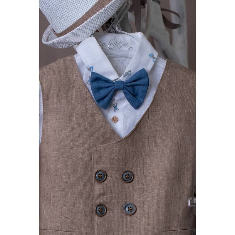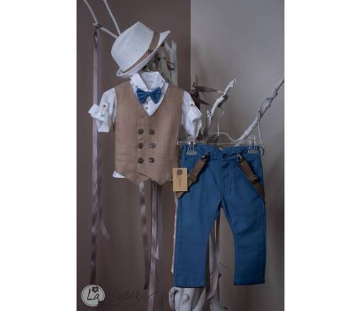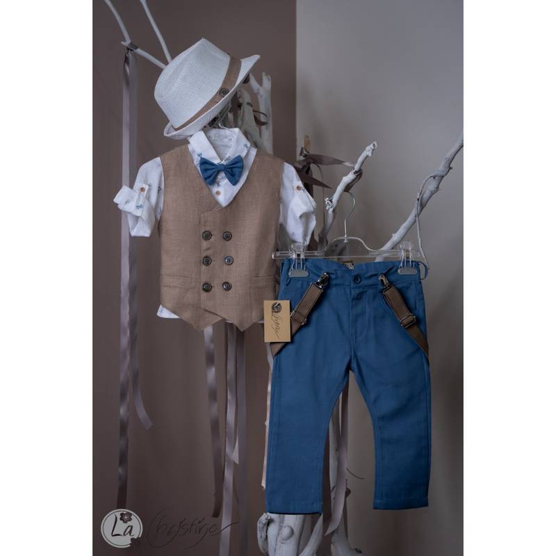 Βαπτιστικό σύνολο το οποίο αποτελείται απο λινό γιλέκο σε chocolat απόχρωση με πουκάμισο με μοτιφάκια απο παπιγιόν, και παντελόνι σε μπλέ ρουά απόχρωση. Το σύνολο περιλαμβάνει ψάθινο καβουράκι, παπιγιόν και τιράντες.