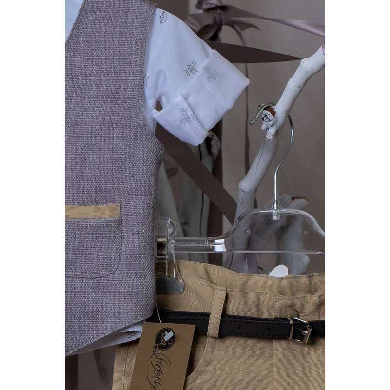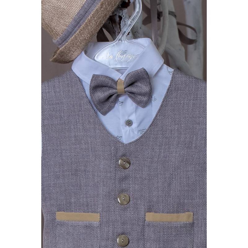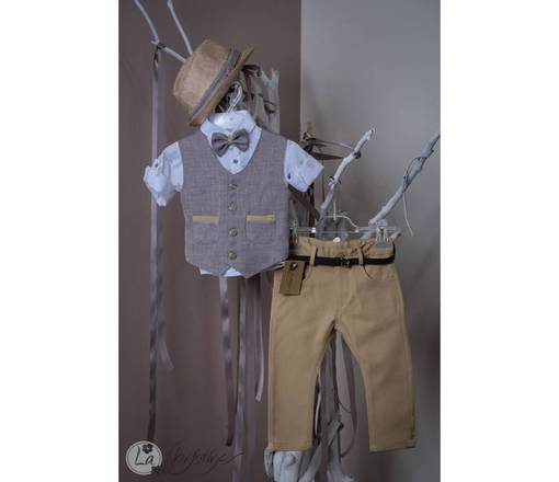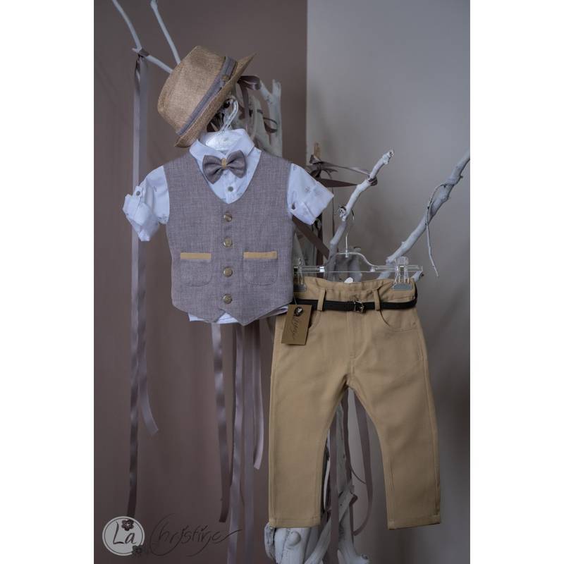 Βαπτιστικό σύνολο το οποίο αποτελείται απο γκρί γιλέκο με μουσταρδί λεπτομέρειες στις τσέπες με βαμβακερό πουκάμισο με μοτίβο καραβάκια, και μουσταρδί βαμβακερό παντελόνι. Το σύνολο περιλαμβάνει ψάθινο καβουράκι, παπιγιόν και ζώνη.