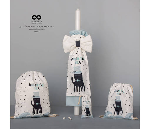 Χειροποίητο πακέτο βάπτισης «βυθός» με μοντέρνα αισθητική, κατασκευασμένο με εξαιρετικής ποιότητας υφάσματα. Το σετ περιλαμβάνει λαμπάδα, υφασμάτινη τσάντα βάπτισης, λαδοσέτ, λαδόπανα(πετσέτα μεγάλη, πετσέτα μικρή, εσωρουχάκια).