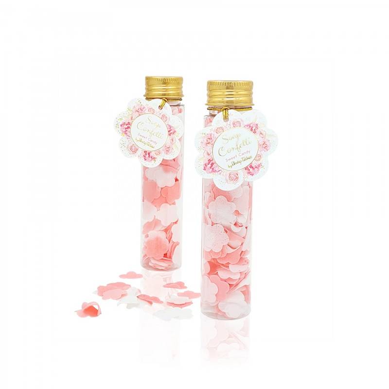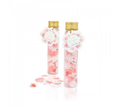 Confetti λουλουδάκια σαπουνάκια 10gr σε πλαστικό διάφανο δοχείο 2,8cm x13cm ύψος, μαζί με καρτάκι με χρυσοτυπία.