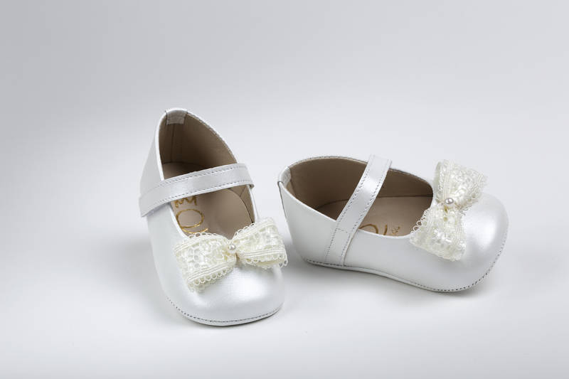 Κ2203Ε Μπαλαρίνα αγκαλιάς από εκρού δέρμα, διακοσμημένη με φιογκάκι από δαντέλα και σατέν με πέρλα, κλείσιμο με Velcro,