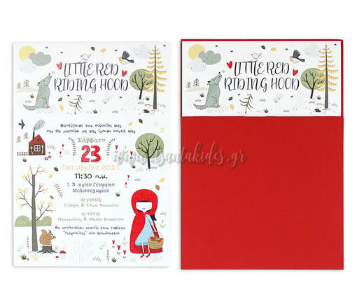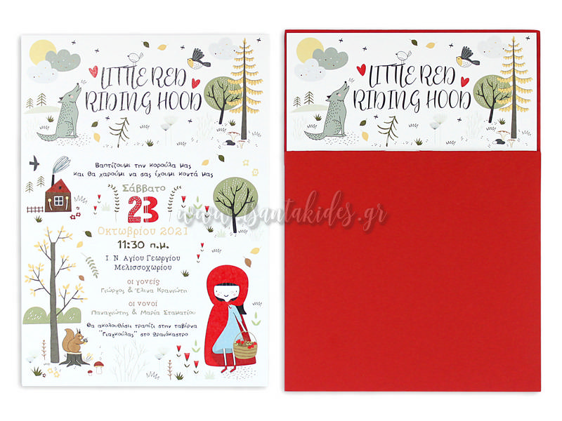 Προσκλητήριο βάπτισης για κορίτσι με θέμα την κοκκινοσκουφίτσα στο δάσος