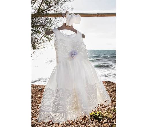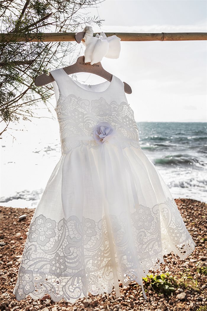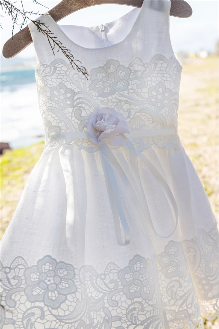 Στο ύψος της μέσης έχει ένα χειροποίητο λινό λουλούδι και σατέν κορδέλα.