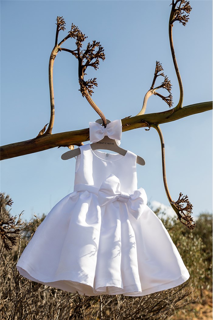 Στη μέση έχει ζώνη με φιόγκο από το ίδιο ύφασμα.