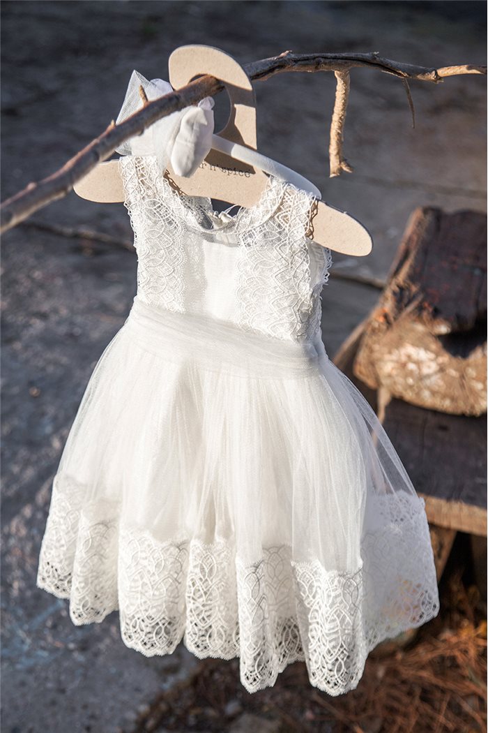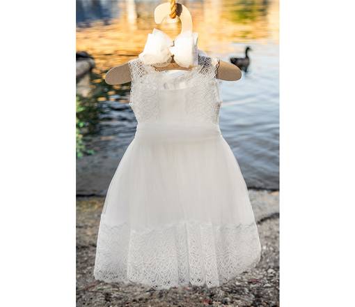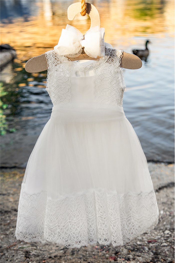 Πλούσια βαμβακερή δαντέλα αγκαλιάζει το μπούστο και περιμετρικά τη φούστα του φορέματος.