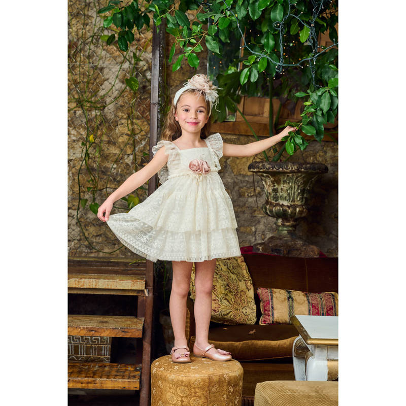 Φόρεμα βάπτισης από βαμβακερή δαντέλα σε εκρού απόχρωση, με διπλή σειρά από βολάν και σχέδιο ανθάκια με κλαδάκια. Μανίκια με βολάν δεντέλα, ζώνη χειροποίητη με υφασμάτινο χειροποίητο λουλούδι σε nude απόχρωση. Το φόρεμα συνοδεύεται από ασορτί κορδέλα.