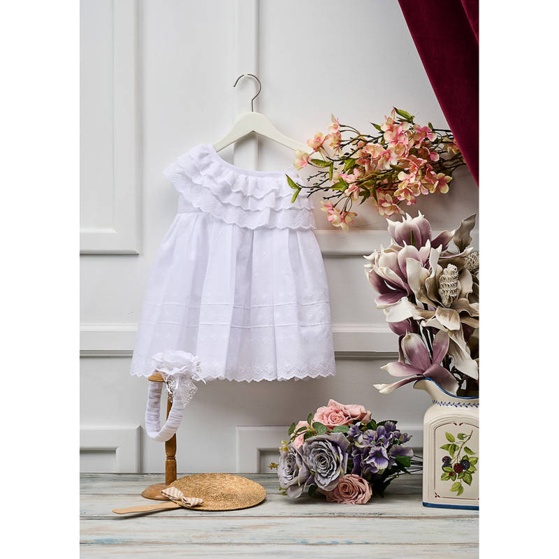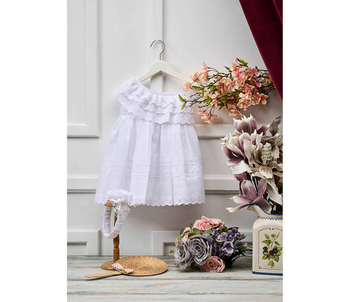 Φόρεμα βάπτισης από βαμβακερό μπροντερί λευκής απόχρωσης με τριπλό βολάν στο μπούστο. Το φόρεμα συνοδεύεται από ασορτί χειροποίητη κορδέλα στολισμένη με λουλούδι.