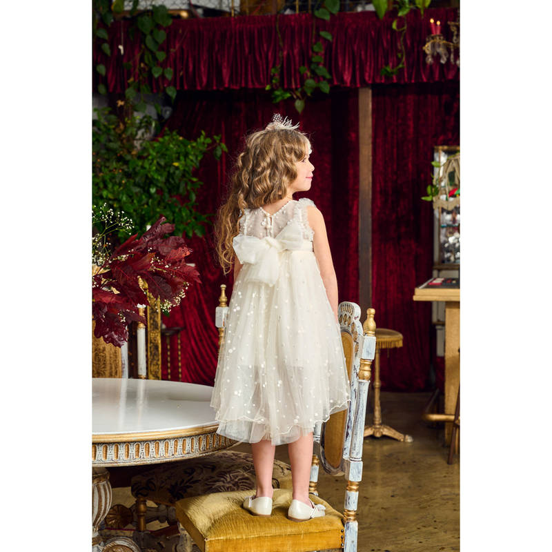 Φόρεμα βάπτισης ασύμετρο από εκρού τούλι και δαντέλα εξωτερικά σε εκρού απόχρωση με μικρό βολάν τούλινο στο μανίκι και χειροποίητο σατέν nude λουλούδι. Το φόρεμα συνοδεύεται από κορδέλα με ασορτί λουλούδι.