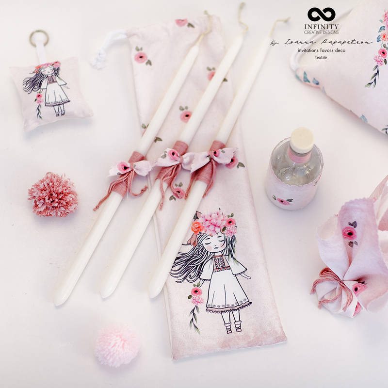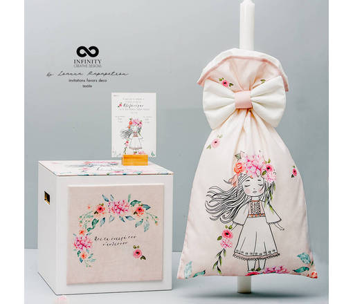 Χειροποίητο, πλήρες πακέτο βάπτισης κοριτσιού σε ρομαντικό ύφος και υπέροχες παστέλ αποχρώσεις. Κατασκευασμένο απο εξαιρετικής ποιότητας υφάσματα και με άκρως μοντέρνα αισθητική. Το σετ περιλαμβάνει λαμπάδα μαξιλαροθήκη, κουτί(το καπάκι μπορεί να κρεμαστεί σαν κάδρο), λαδοσέτ, λαδόπανα(πετσέτα μεγάλη, πετσέτα μικρή, εσωρουχάκια)
