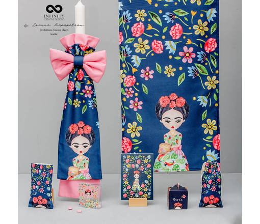 Χειροποίητο πακέτο βάπτισης «Frida» με μοντέρνα αισθητική, κατασκευασμένο με εξαιρετικής ποιότητας υφάσματα. Το σετ περιλαμβάνει λαμπάδα, υφασμάτινη τσάντα βάπτισης, λαδοσέτ, λαδόπανα(πετσέτα μεγάλη, πετσέτα μικρή, εσωρουχάκια)