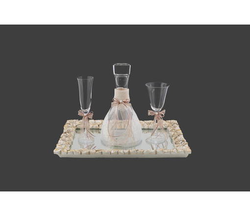 - Καράφα με φιόγκο από μόκα δαντέλα και πέρλα. Ο φιόγκος είναι εμπλουτισμένος με κορδελάκια ιβουάρ και μόκα. Το κάτω μέρος της καράφας είναι διακοσμημένο με ιβουάρ δαντέλα.