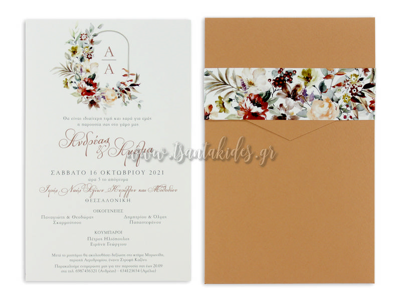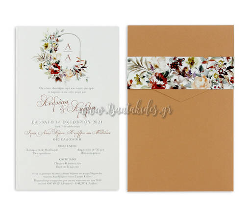 Προσκλητήριο γάμου με bohemian ύφος, floral στοιχεία και πλαίσιο για τα μονογράμματα του