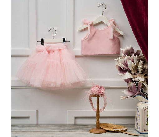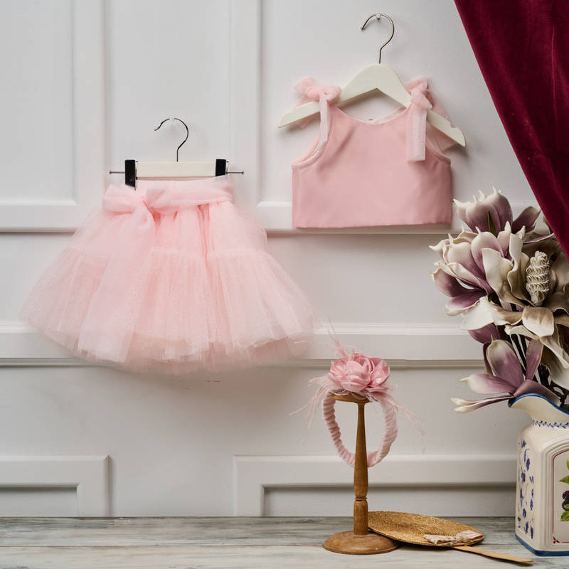 Βαπτιστικό σύνολο crop - top σε απαλή απόχρωση ροζ στο μπούστο, σατέν ύφασμα και τιράντες δετές. Φούστα τούλινη σε απαλή απόχρωση πούδρας με glitter. Το σύνολο συνοδεύεται από χειροποίητη κορδέλα και λουλούδι.
