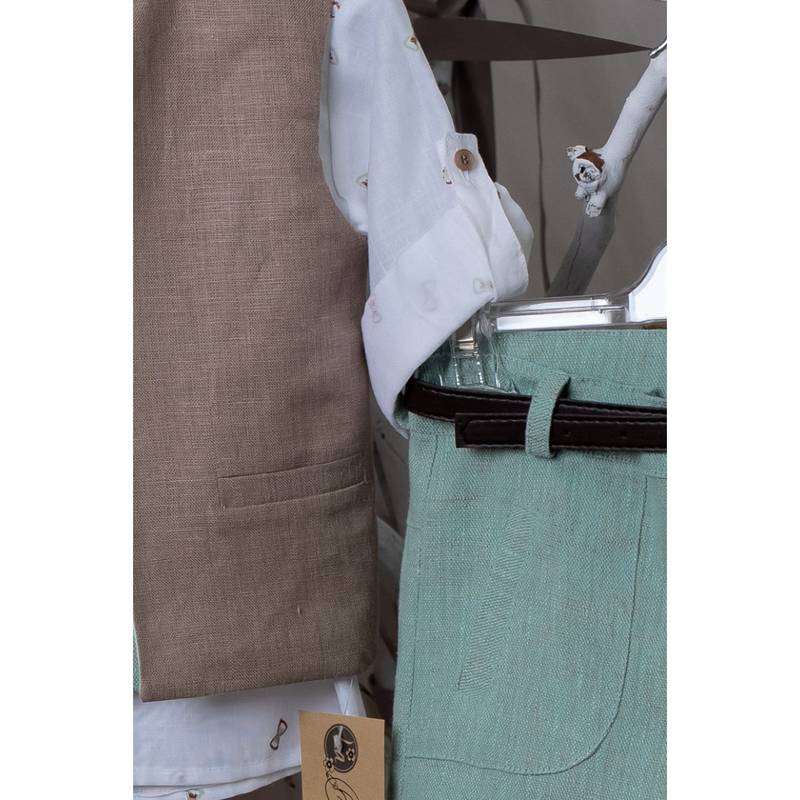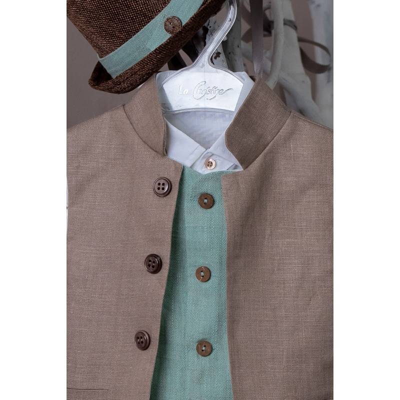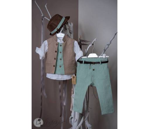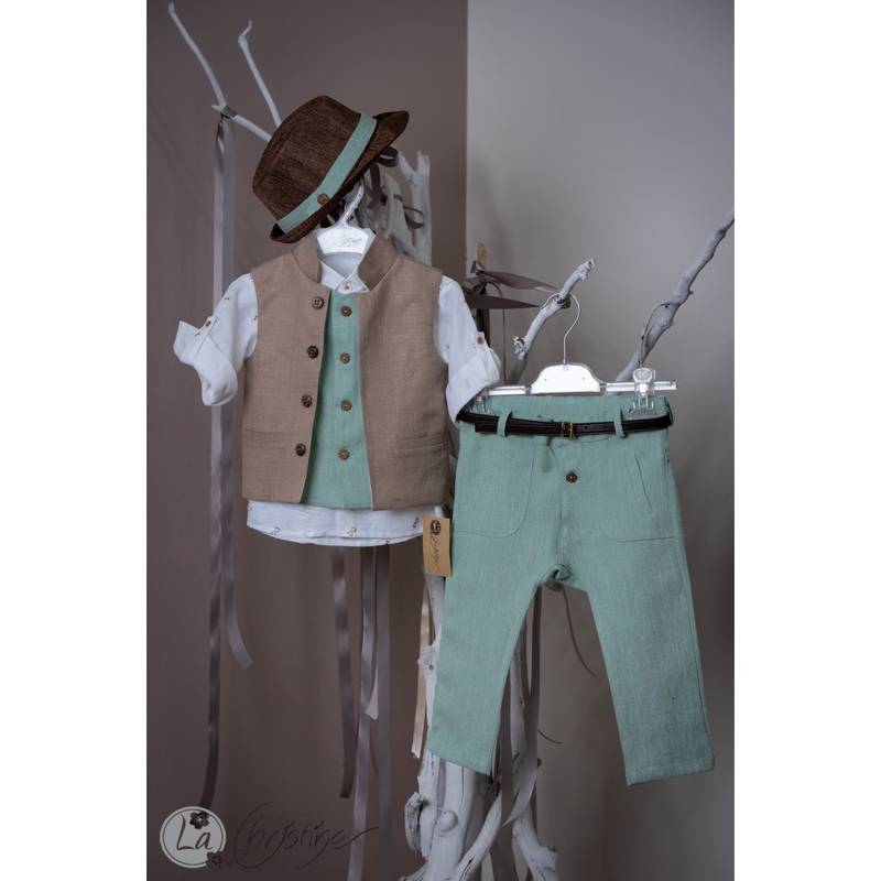 Βαπτιστικό σύνολο το οποίο αποτελείται απο λινό διπλό γιλέκο σε chocolat και μέντα απόχρωση με λινό πουκάμισο με μοτιφάκια απο παπιγιόν, και λινό παντελόνι σε μέντα απόχρωση. Το σύνολο περιλαμβάνει ψάθινο καβουράκι και ζώνη.