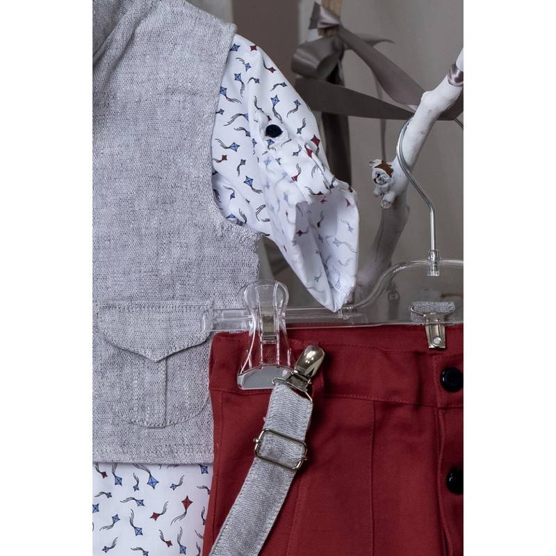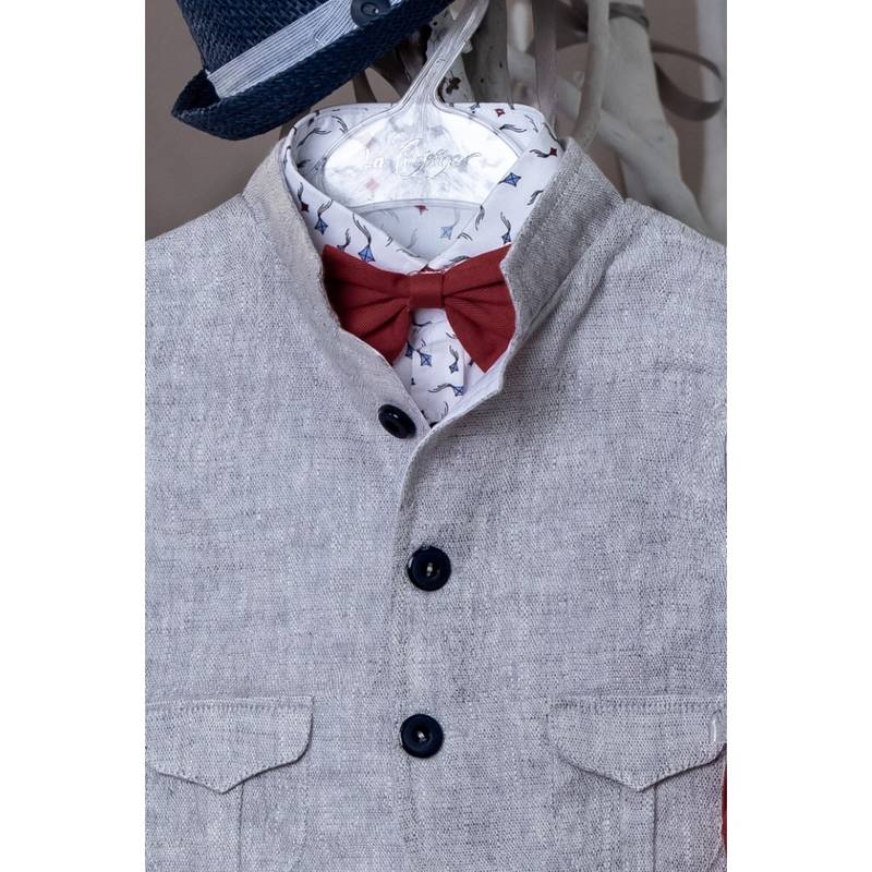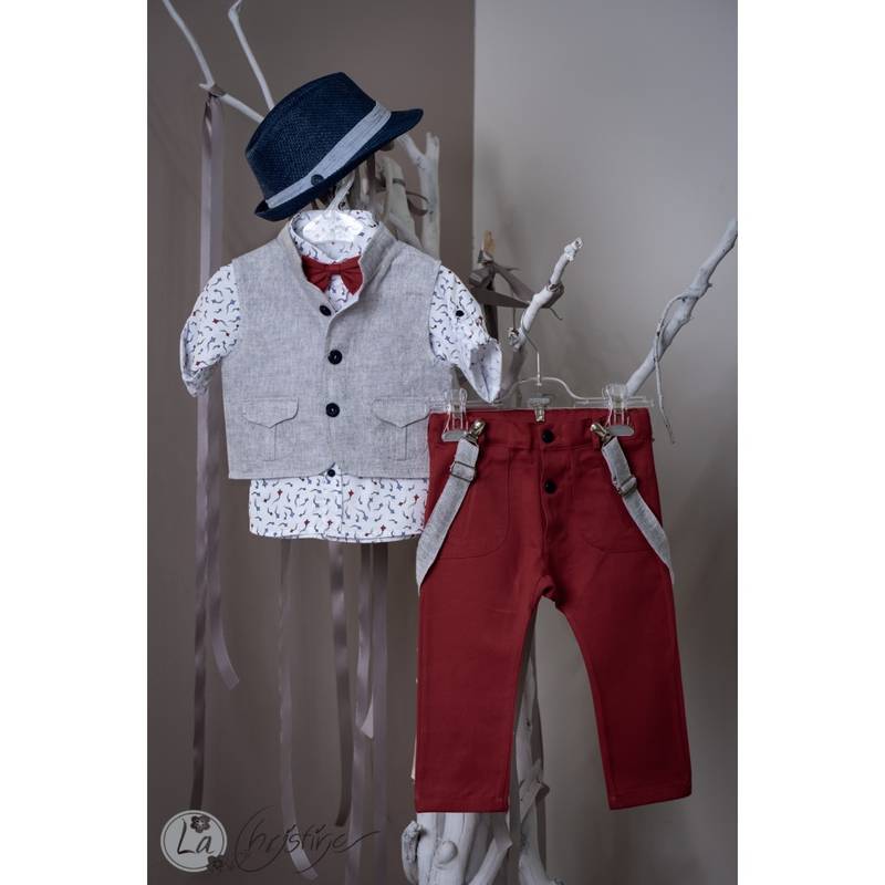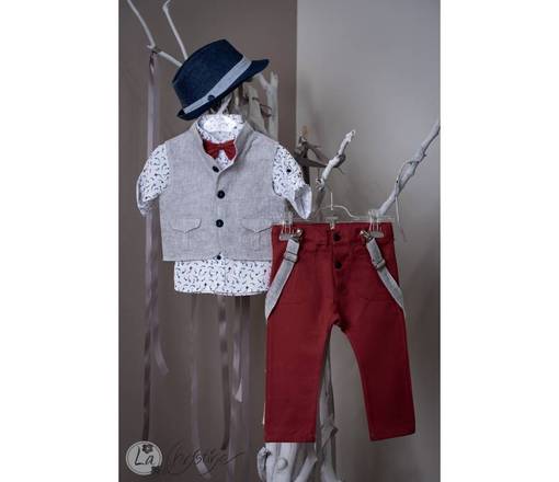 Βαπτιστικό σύνολο το οποίο αποτελείται απο λινό γκρί ανοιχτό γιλέκο με γιακά τύπου μάο, με λευκό πουκάμισο με μοτιφάκια χαρταετούς, και κόκκινο βαμβακερό παντελόνι. Το σύνολο περιλαμβάνει ψάθινο καβουράκι, παπιγιόν και τιράντες.