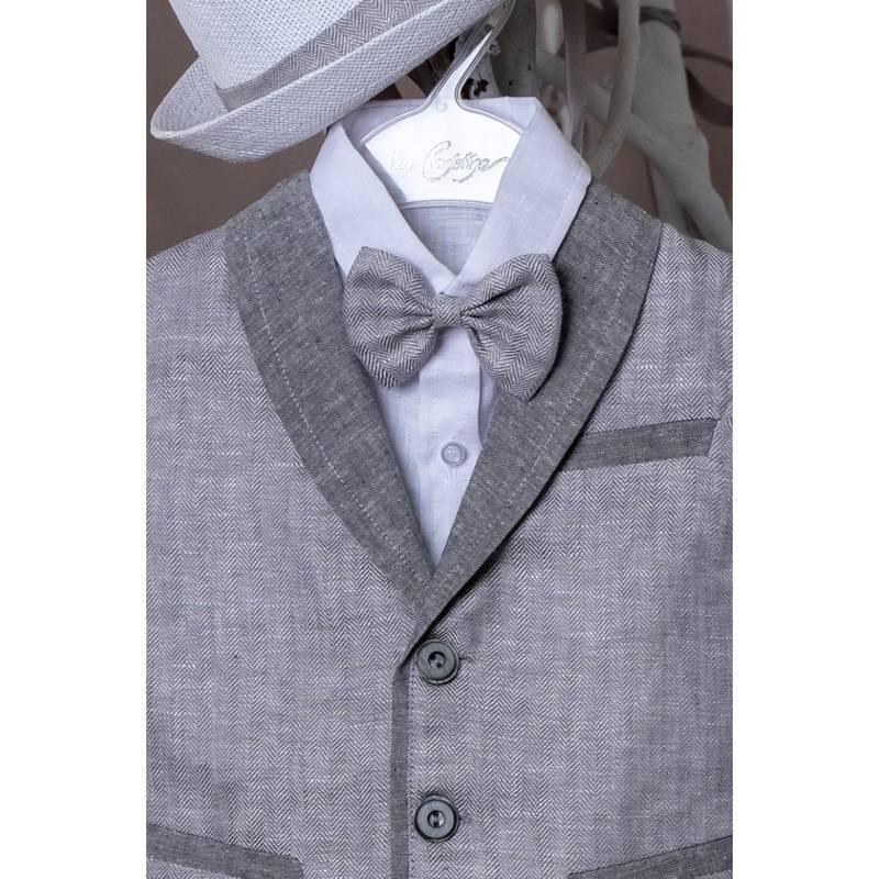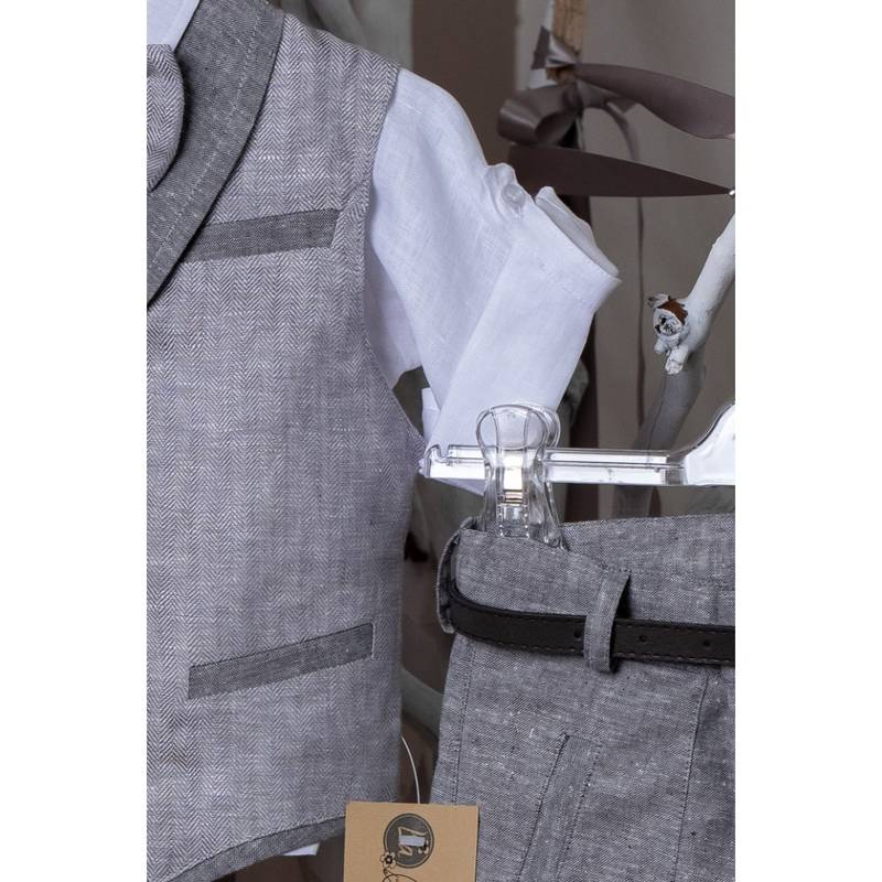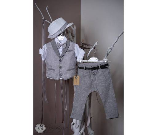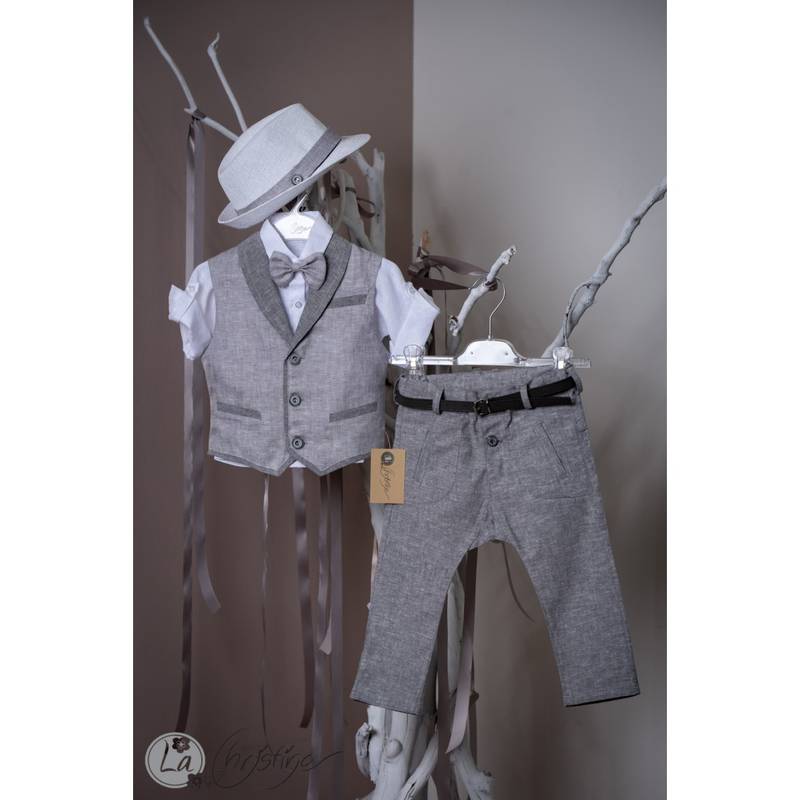 Βαπτιστικό σύνολο το οποίο αποτελείται απο λινό γιλέκο ψαροκόκκαλο σε γκρί απόχρωση με λευκό λινό πουκάμισο, και λινό γκρί παντελόνι. Το σύνολο περιλαμβάνει ψάθινο καβουράκι, παπιγιόν και ζώνη.