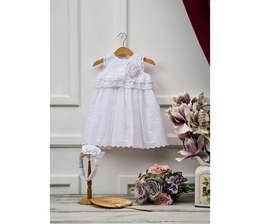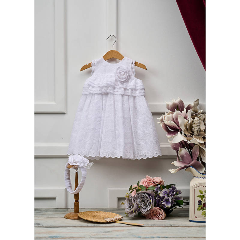 Φόρεμα βάπτισης από βαμβακερό μπροντερί σε λευκή απόχρωση με σχέδιο, διπλό βολάν στο μπούστο και διακοσμημένο χειροποίητο λουλούδι. Το φόρεμα συνοδεύεται με χειροποίητη κορδέλα και λουλούδι.