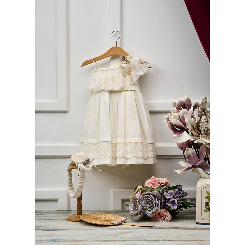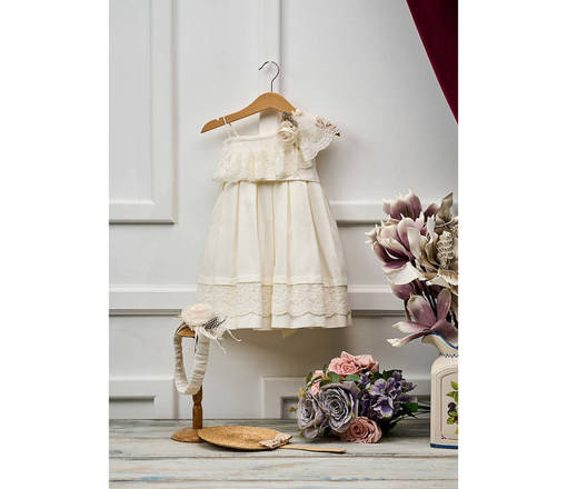 Φόρεμα βάπτισης από βαμβακερό πικέ ύφασμα σε εκρού απόχρωση, μανίκι με βολάν δαντέλα, χειροποίητο λουλούδι και λεπτό τιραντάκι. Το φόρεμα συνοδεύεται από ασορτί κορδέλα.