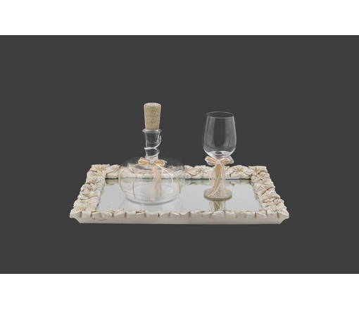 - Καράφα διακοσμημένη με τρέσα από ασημί strass στο πώμα της. Η καράφα είναι διακοσμημένη με φιόγκο από μόκα δαντέλα, σκοινάκια σε απόχρωση ιβουάρ και strass στη μέση από τον φιόγκο. Επιπλέον διαθέτει ασημί μέταλλο στο λαιμό.