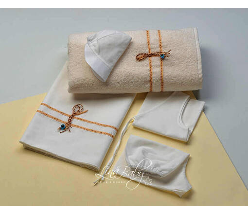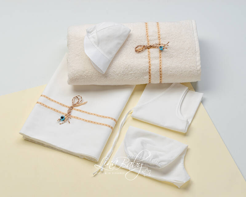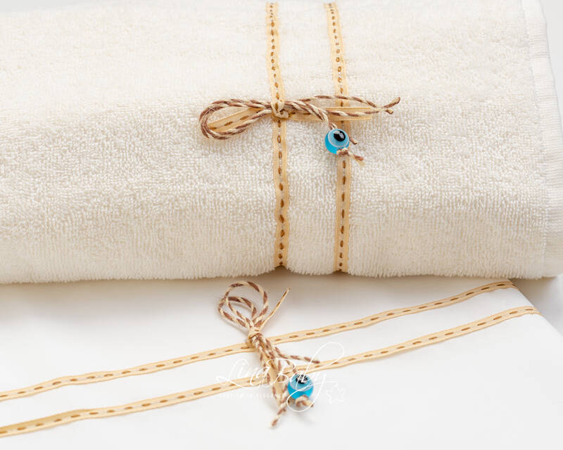 Βαμβακερό σετ λαδόπανου σε εκρού χρώμα με φάσα από λινό μπεζ ύφασμα, γκρο τρέσα και χάντρα διακοσμητική.
