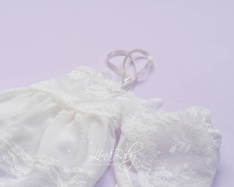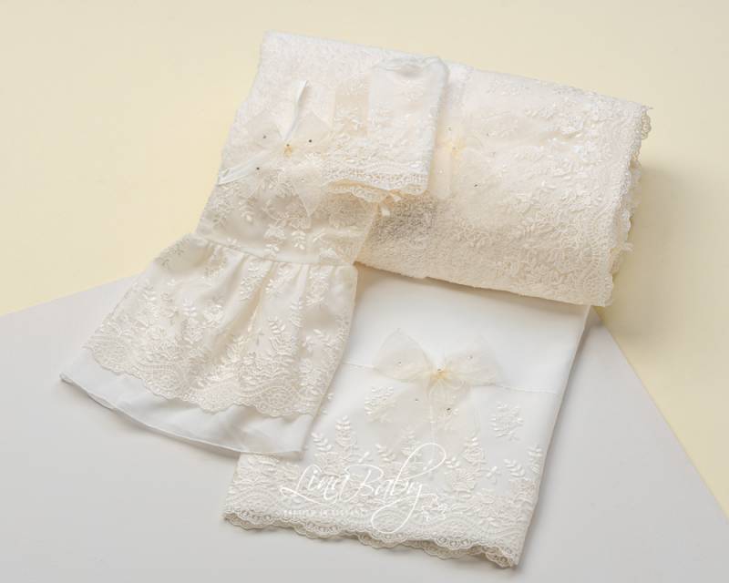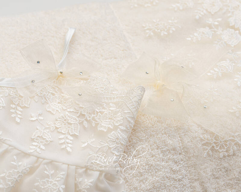 Βαμβακερό σετ λαδόπανου σε δύο χρώματα λευκό και ιβουάρ με εντυπωσιακή γαλλική  δαντέλα και φιόγκο από οργαντίνα με στρας.