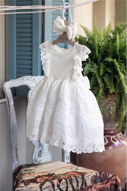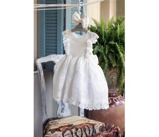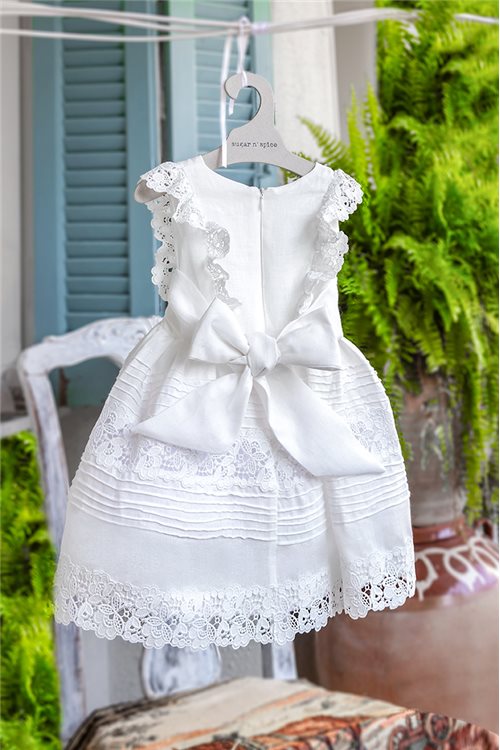 Λινό φόρεμα με βαμβακερή ανάγλυφη δαντέλα. Χειροποίητα νερβίρ σε όλο το φόρεμα.