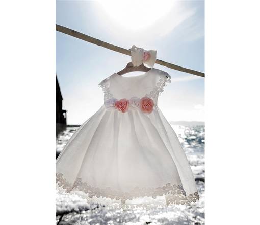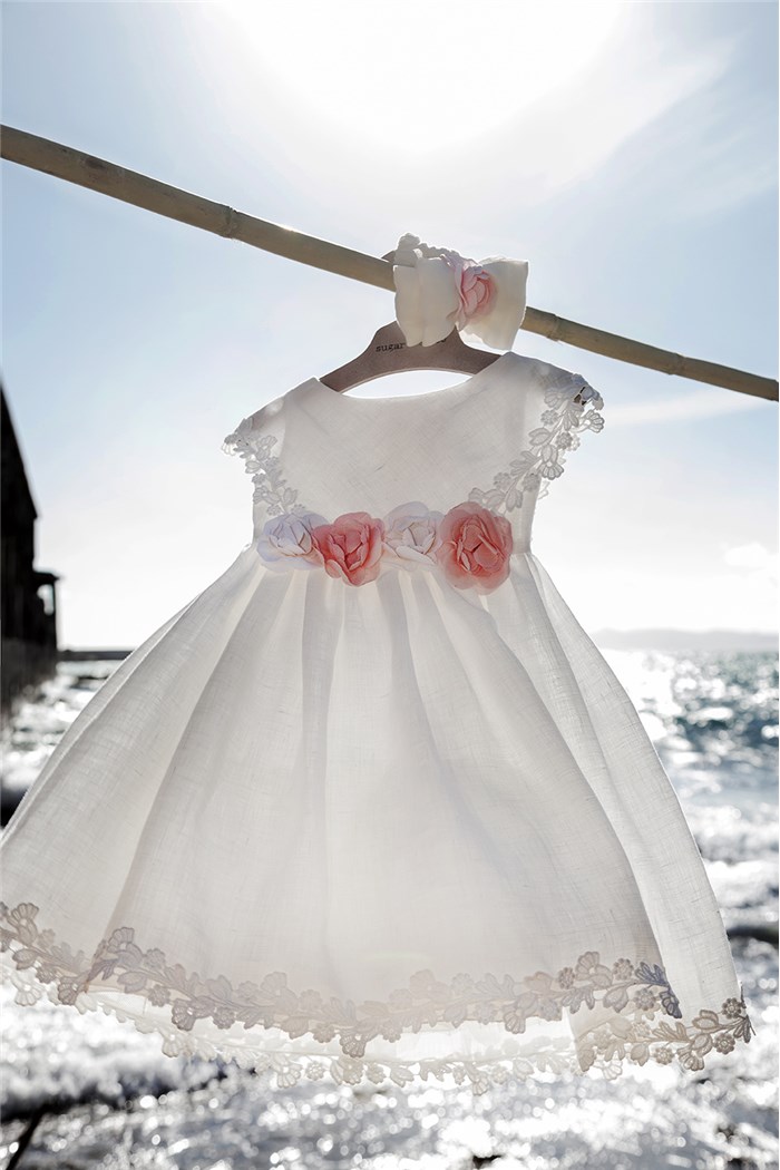 Στο ύψος της μέσης έχει χειροποίητα λινά λουλούδια σε λευκό και ροζ.