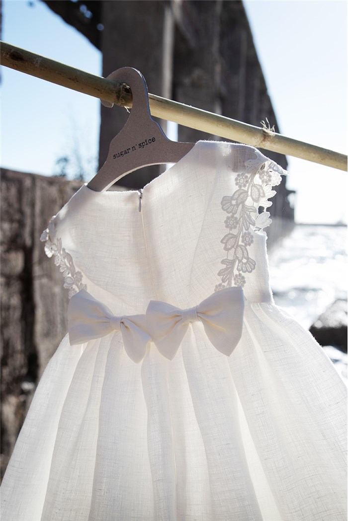 Στο πίσω μέρος του φορέματος έχει 2 λινά φιογκάκια.