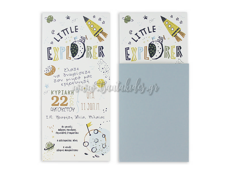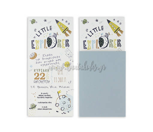 Προσκλητήριο βάπτισης για αγόρι με θέμα τον little explorer στο διάστημα. Το