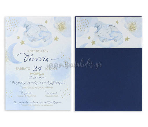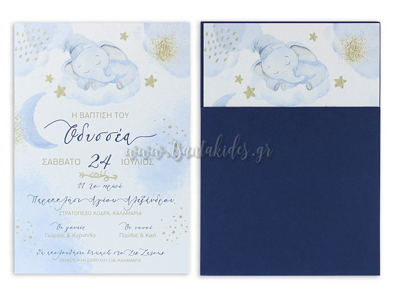 Προσκλητήριο βάπτισης για αγόρι με θέμα το μικρό ελεφαντάκι σε παστέλ αποχρώσεις. Το