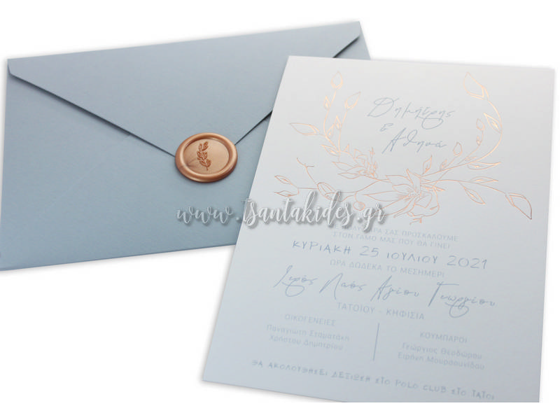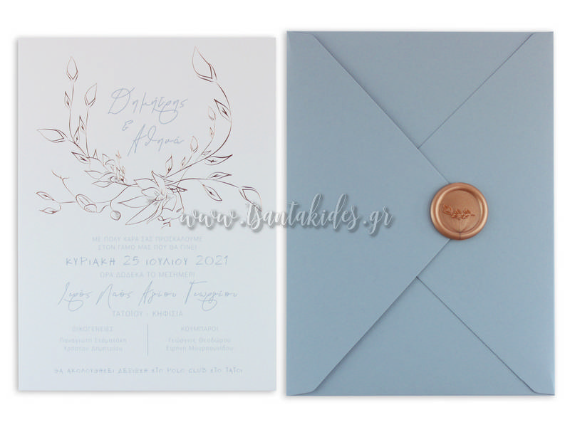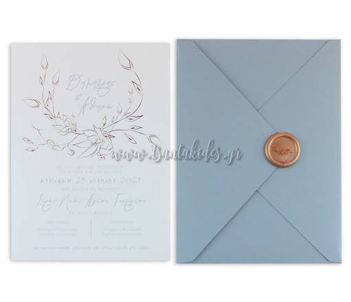 προσκλητήριο διαθέτει φάκελο διάστασης 22×16cm σε dusty blue ματ χαρτί 300γρ. Η εσωτερική κάρτα