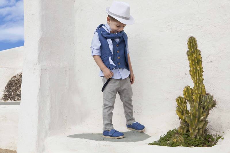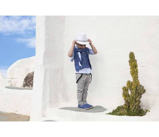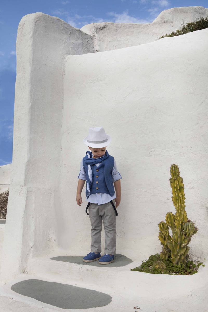 Μοντέρνο σετ βάπτισης 7 τεμαχίων που το χαρακτηρίζουν τα ανατρεπτικά χρώματα που έχουν συνδυαστεί. Περιλαμβάνει γιλέκο διπλό σιέλ ψάθα με κουμπάκια μπροστά, πουκάμισο σιέλ και παντελόνι σιέλ ριγέ. Στο σετ περιλαμβάνονται τιράντες ,ξύλινο παπιγιόν ,δίχρωμο φουλάρι και ψάθινο καπέλο ή μπερές.