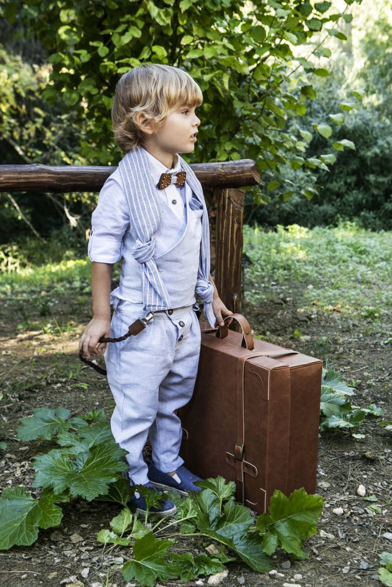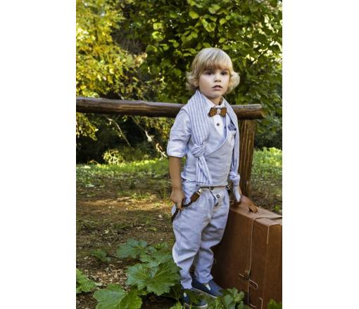 Ένα ιδιαίτερο σέτ Baby Bloom της συλλογής Printemps 2023 , σε light grey απόχρωση . Αποτελείται από γιλέκο με πλάγιο κούμπωμα, λευκό λινό πουκάμισο και παντελόνι με πιέτες και λοξό κούμπωμα, δίχρωμο φουλάρι , τίράντες, ξύλινο παπιγιόν ,καπέλο ψάθινο ή μπερές .